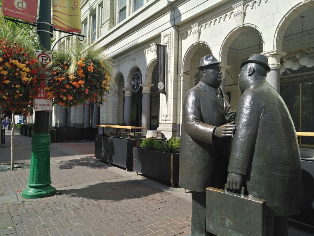 “The Conversation” is a humorous bronze sculpture in the large pedestrian mall “Stephen Avenue”, it depicts two businessmen who have just met. The sculpture is so realistic that you want to shake hands with the men and join the conversation. They have the typical appearance of mid-20th century businessmen: tie, coat, fedora and briefcase in hand.