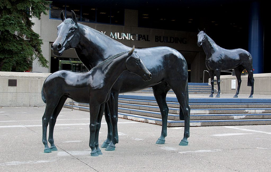 Once the artist Harry O’Hanlon won a public competition, after which his work – statues of horses – had to be cast. Spruce Meadows owner Marg Southern provided half of the required amount (namely $60,000). The group instructed to raising the remaining funds for the sculptures has ceased work. Marg Southern feared the statues would never be cast, so she donated an additional $45,000. Citizens of Calgary raised the rest – $15,000.
