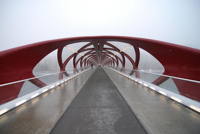 The bridge was made in an unusual shape and color for Calgary. Most of the bridges at that time were white and quite high. The colors chosen for the Peace Bridge are the same as those on the flag of Canada and the flag of Calgary – red and white.